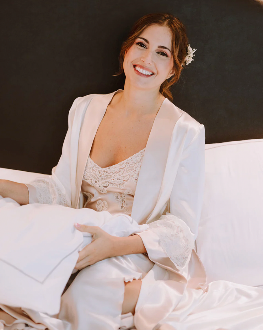 Bata corta de raso con brillo sutil y caída fluida. Manga francesa con encaje delicado y cinturón a tono. Ligera y envolvente, aporta un acabado refinado a los momentos de descanso.