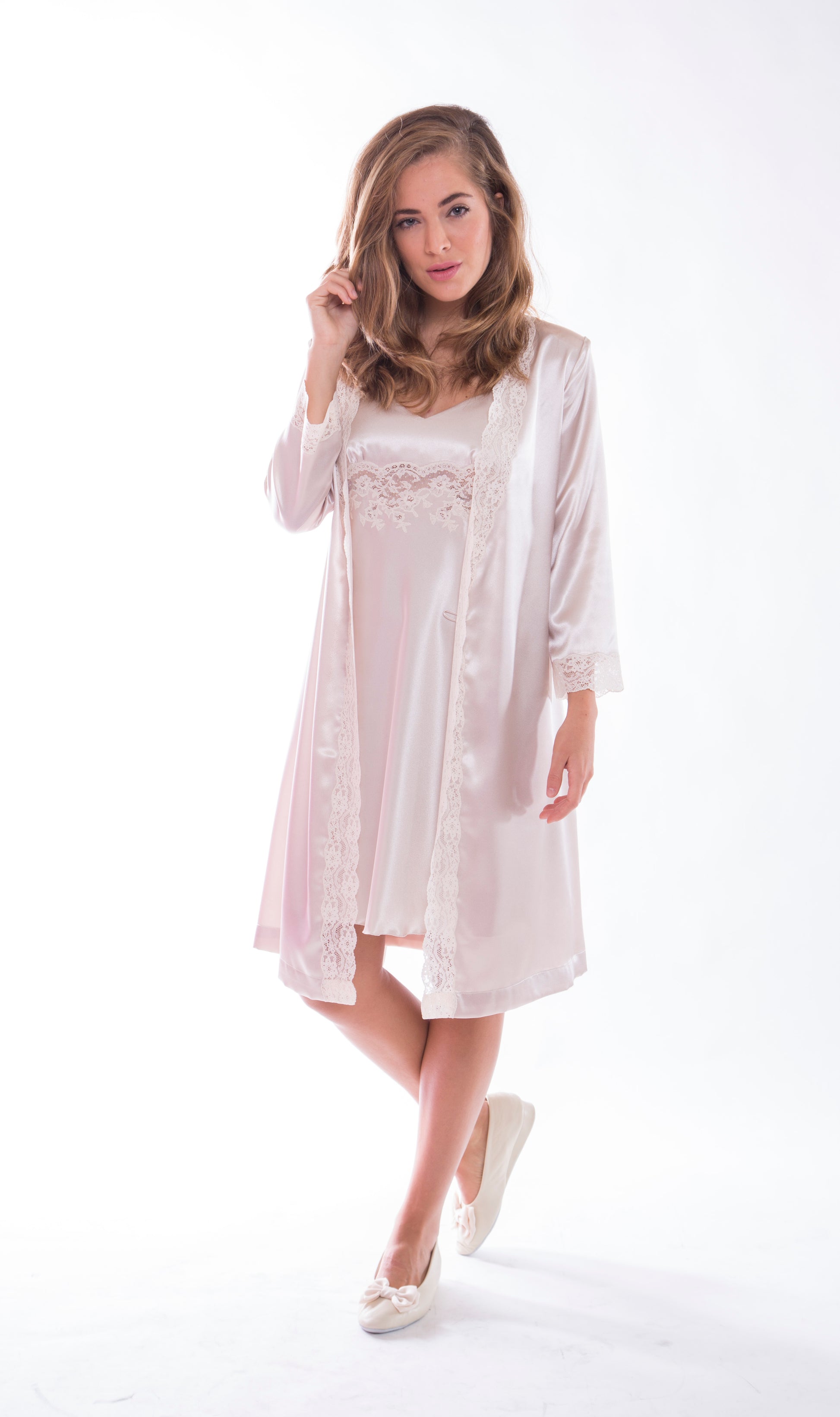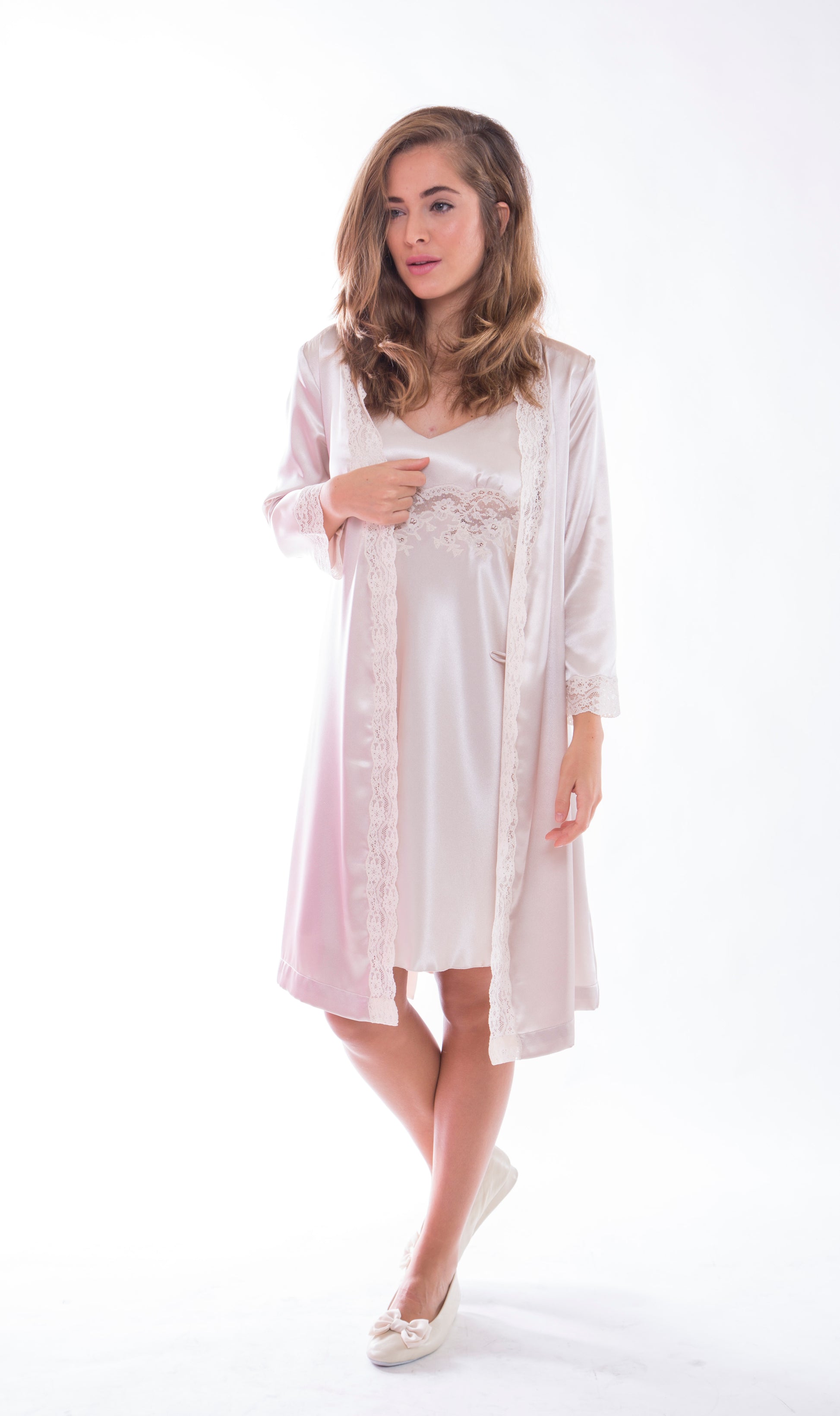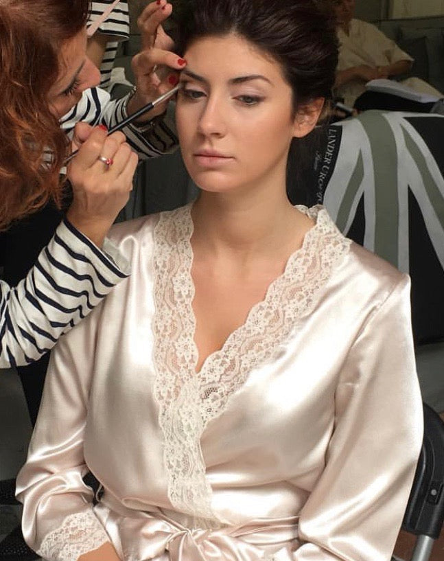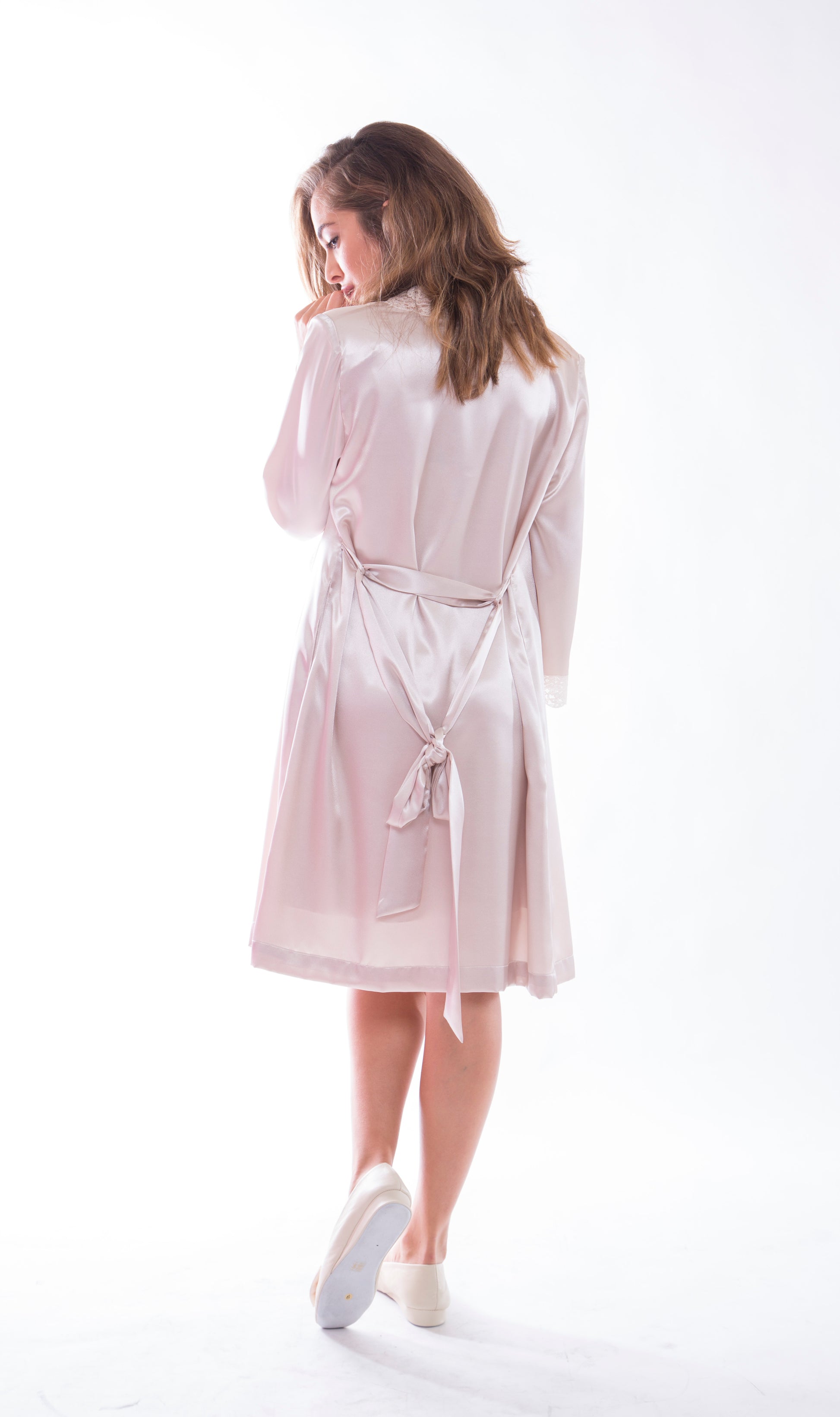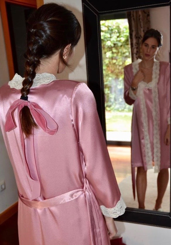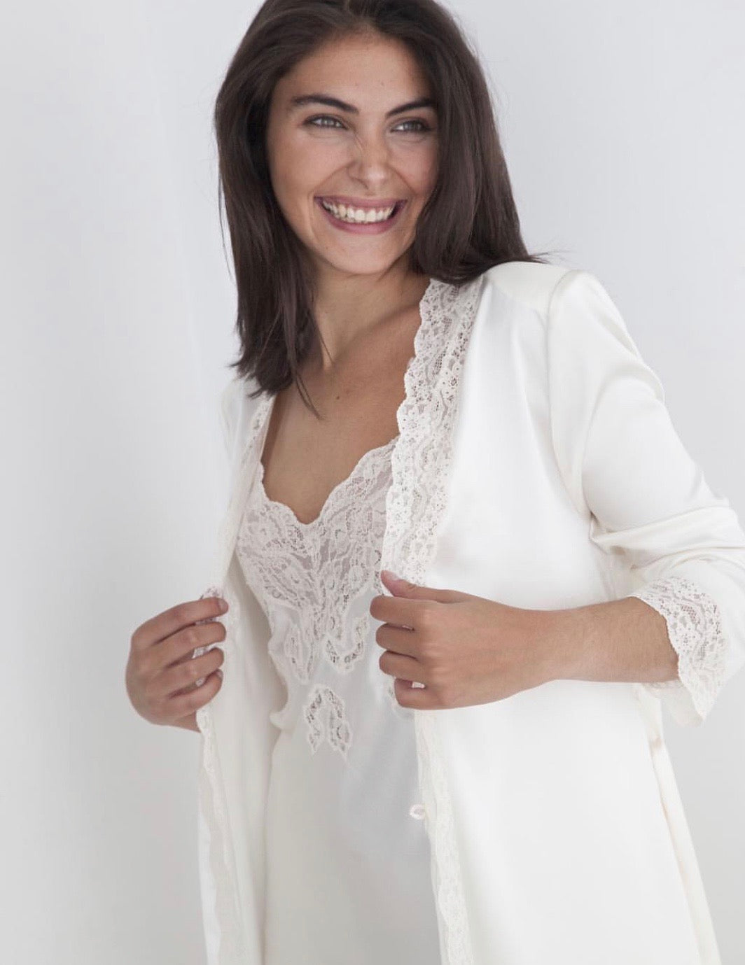Bata corta en raso con encaje de alensón.
