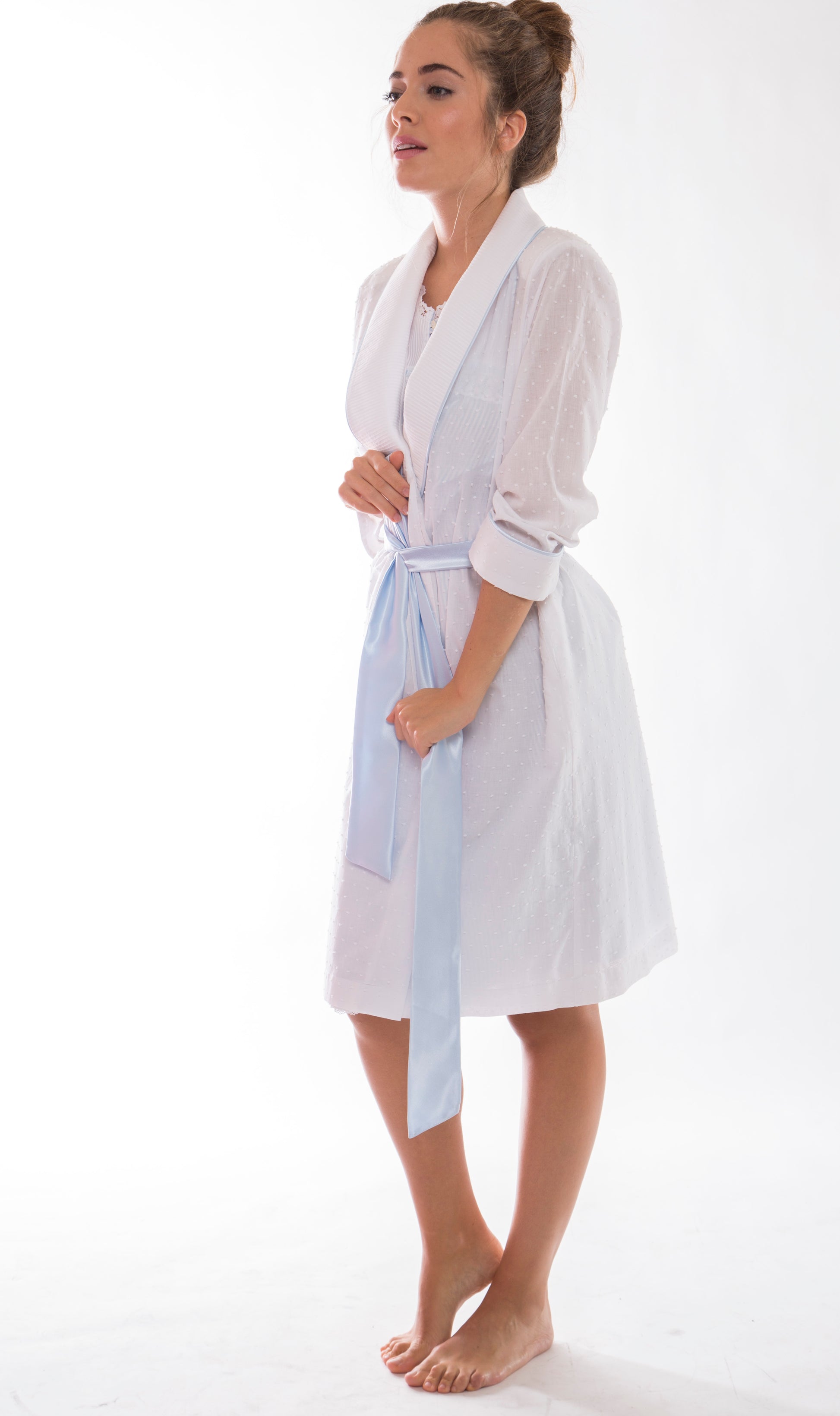 Bata fumadora en plumeti blanco . Disponible con lazo rosa o azul.