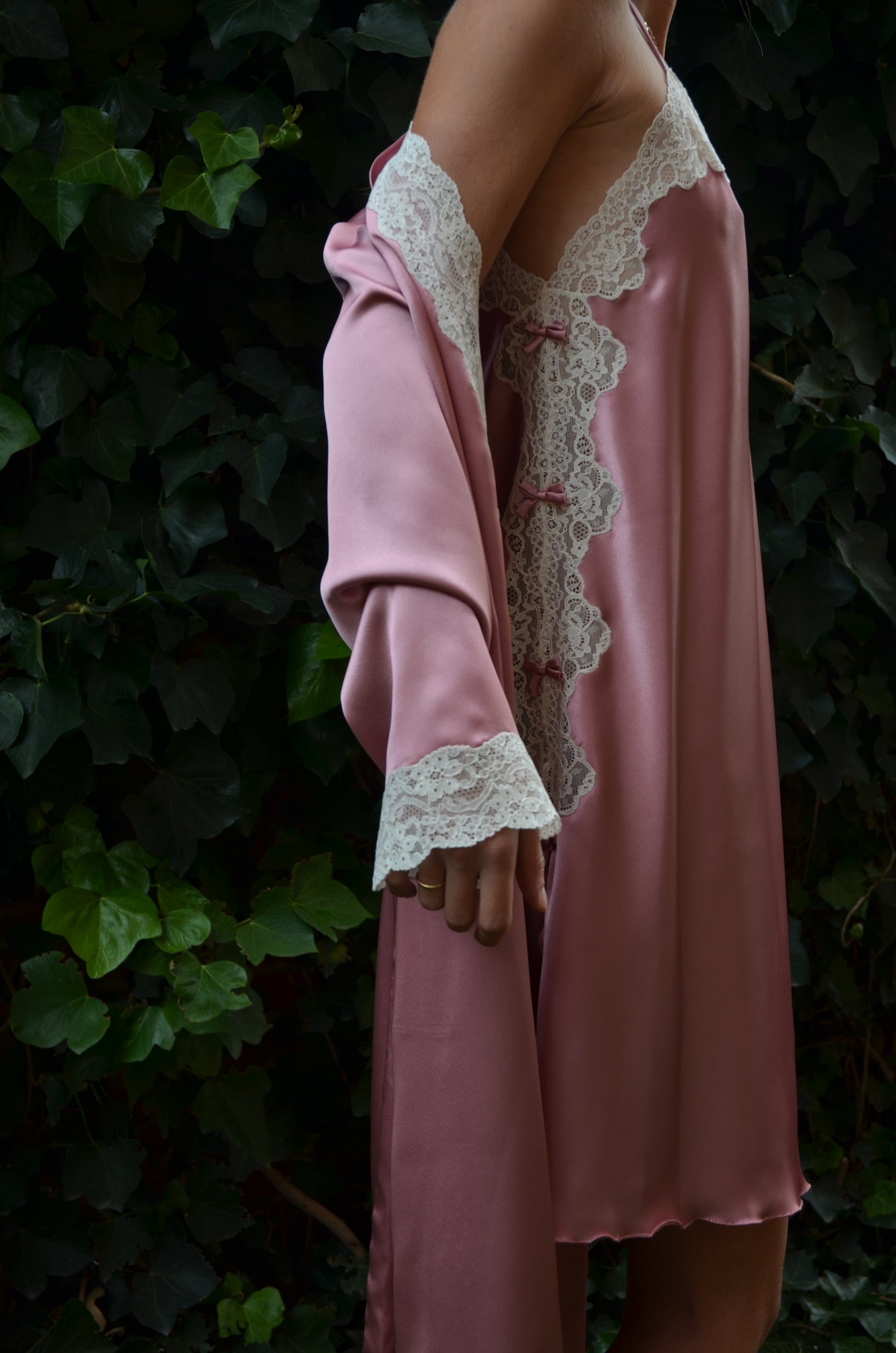 Camisón corto en raso con delicado lateral de encaje de Alensón.