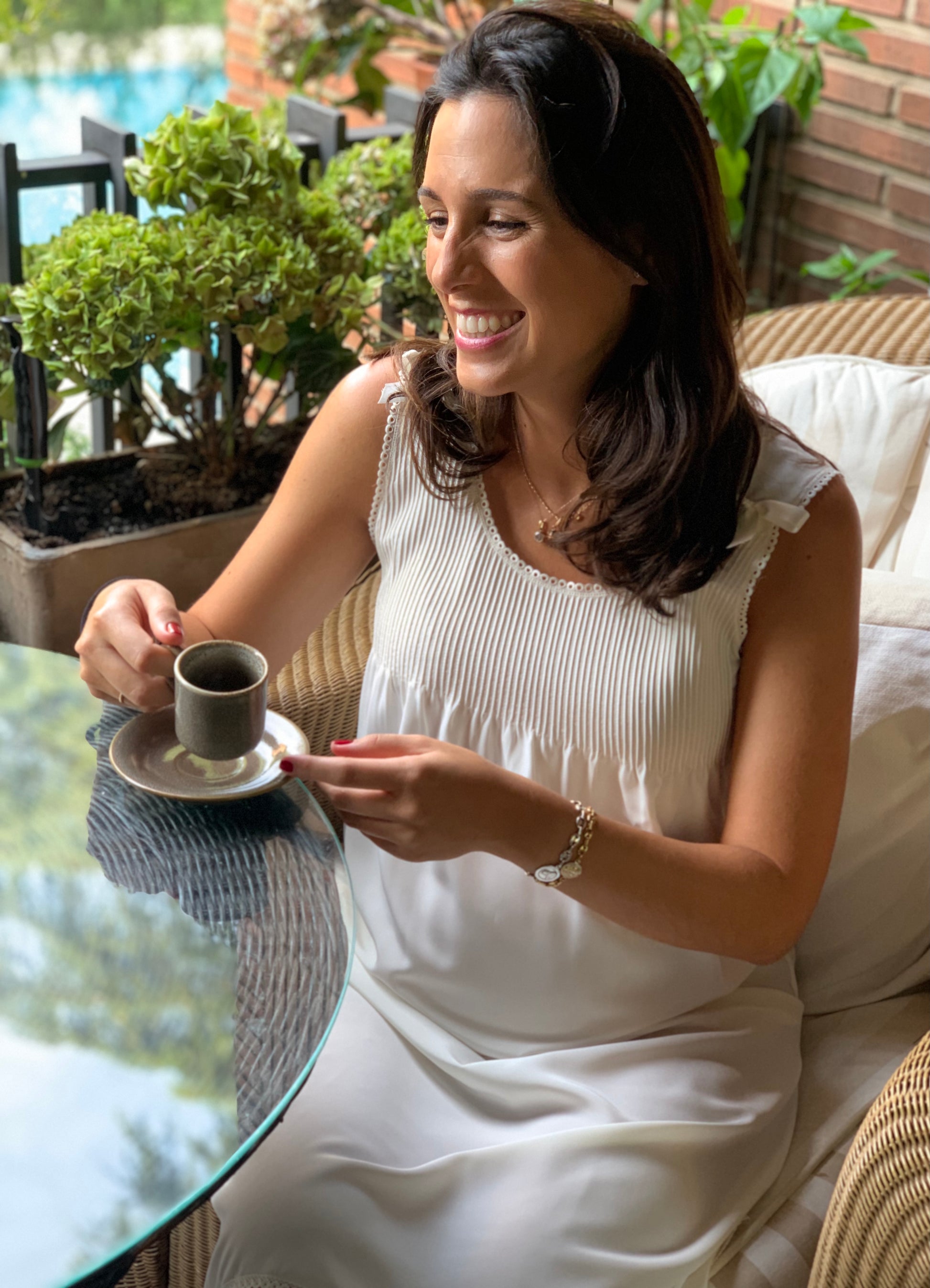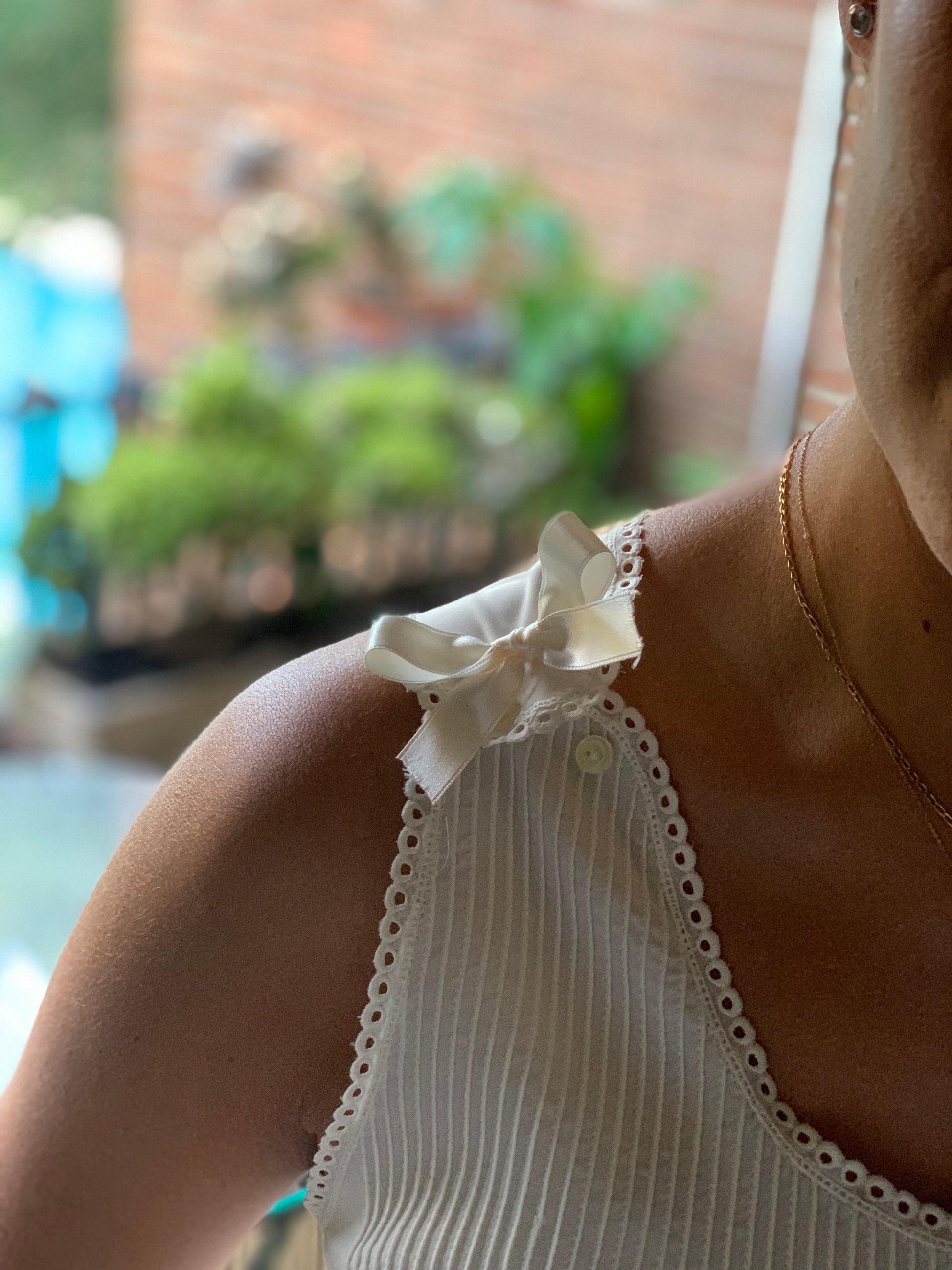 Camisón en microfibra con jaretas en el pecho y botones en los hombros para facilitar la lactancia. Los botones están ocultos por un lazo.